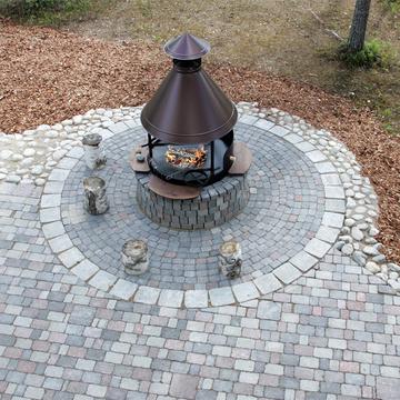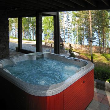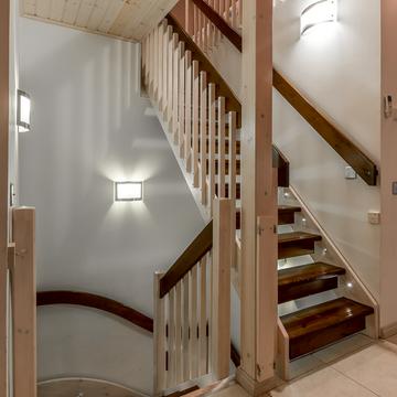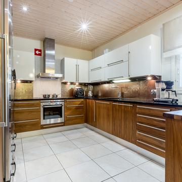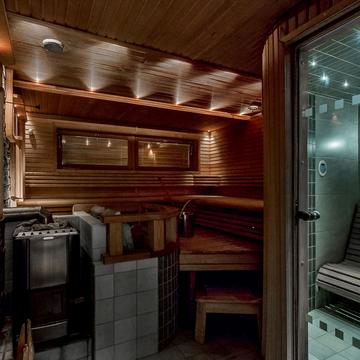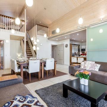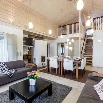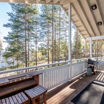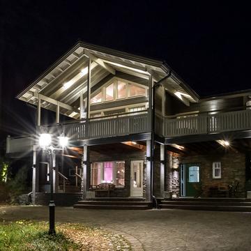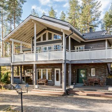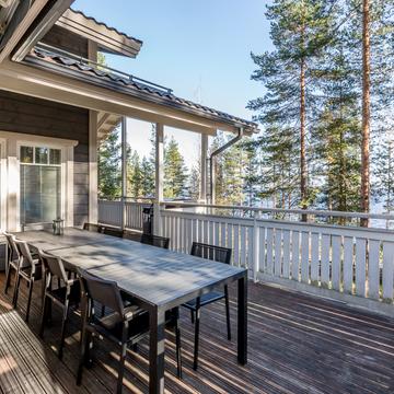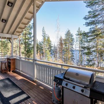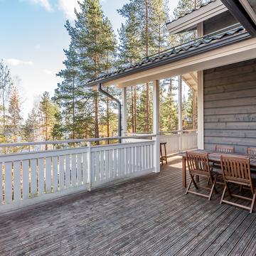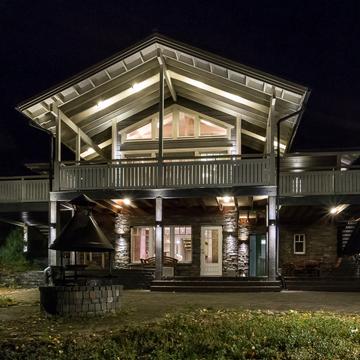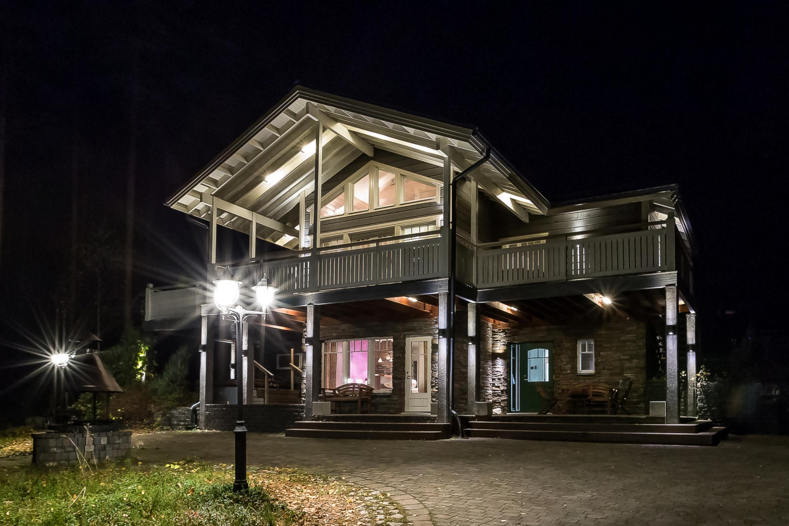 Отдельные выходы с верхнего и нижнего этажа ведут на террасу, где так приятно наслаждаться свежим воздухом, особенно в летнее время. А в газовом гриле на верхней террасе чудесным летним вечером готовятся вкусные угощения. Во дворе есть беседка-барбекю в виде лапландского шалаша - кота-гриль. Здесь на открытом огне можно поджарить не только вкусную закуску, но и приготовить настоящие сытные блюда.
